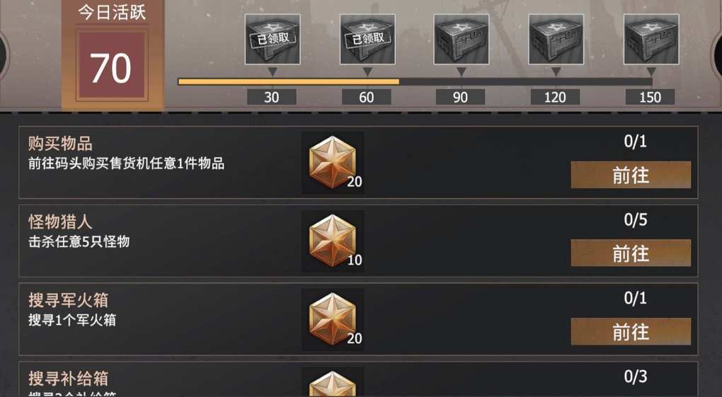 哈喽大家好我是太白,玩过基地的小伙伴们应该都知道行动基地里面零件是非常重要,并且不像木头石头那样容易获取的物资,不过获取方式也不是特别难,下面就总结一下行动基地里面零件的获取方式 ①油桶补给箱工具箱军火箱 这也是比较常规的零件获取方式了,基地里面的倍率和标准服的一样,但是要注意一下,行动基地里面打怪是不掉落任何物资的哦 ②每日任务获取 每日任务每天一共可以获取1100零件,完成任务获得活跃度可以解锁五个阶段的宝箱,分别获得100零件、200零件、300零件、500零件以及贸易抽奖箱