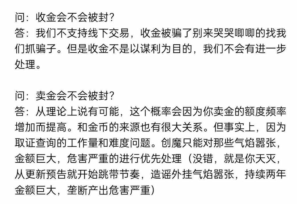 3、我属于长期收金币的人,平时没空上线,折扣又是限时的,每次都容易错过,直充觉得不划算,毕竟谁都喜欢便宜的,所以都是找固定的熟人收金币,他们也都是卡着折扣时间充了存在哪里出金,这几个月自己用,收了五六万金币左右,我朋友出了十万金币左右,而且都是这一两个月,都没有被封,为什么,虽然线下交易了,但是一,没在游戏里面破坏环境打广告骗人,二,没有恶意薅羊毛都是等折扣充值非开小号量刷,三,收金也都是自己用,合情合理的,谁会管你,