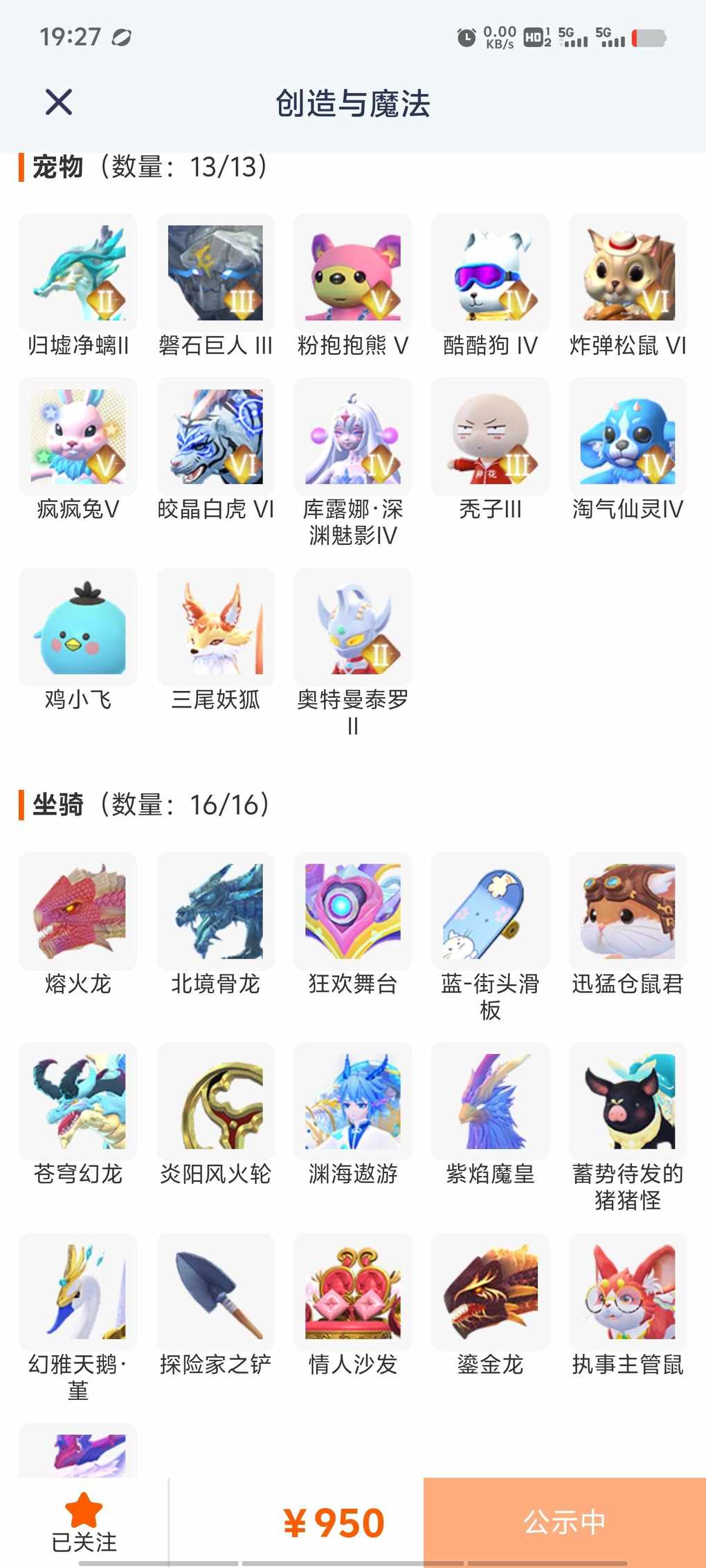 950一挂有空岛皮肤,龙套两只幻龙坐骑