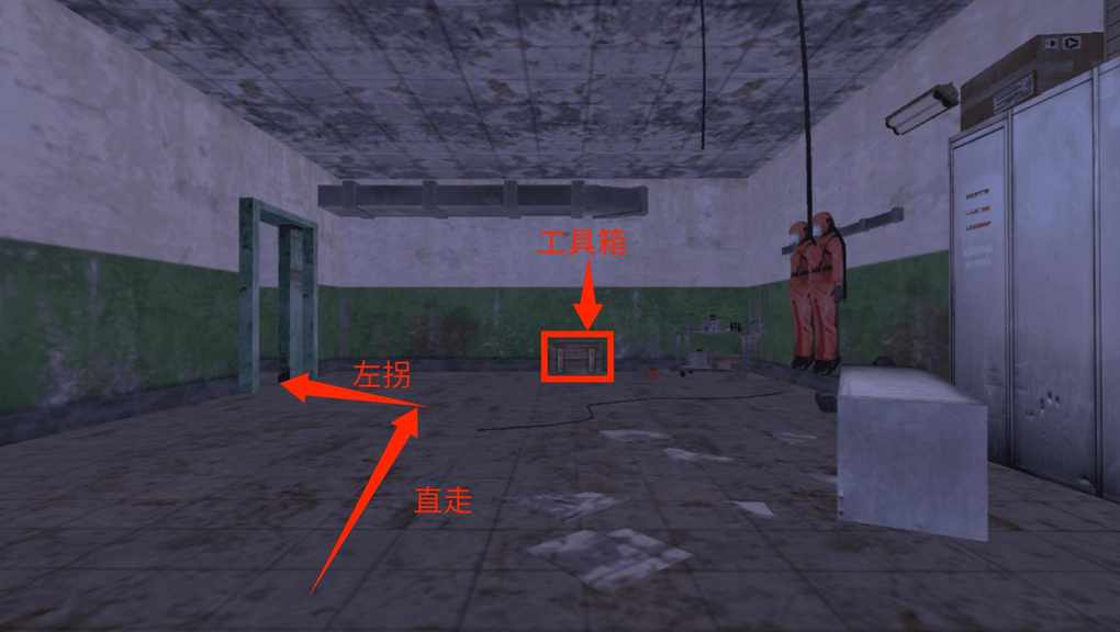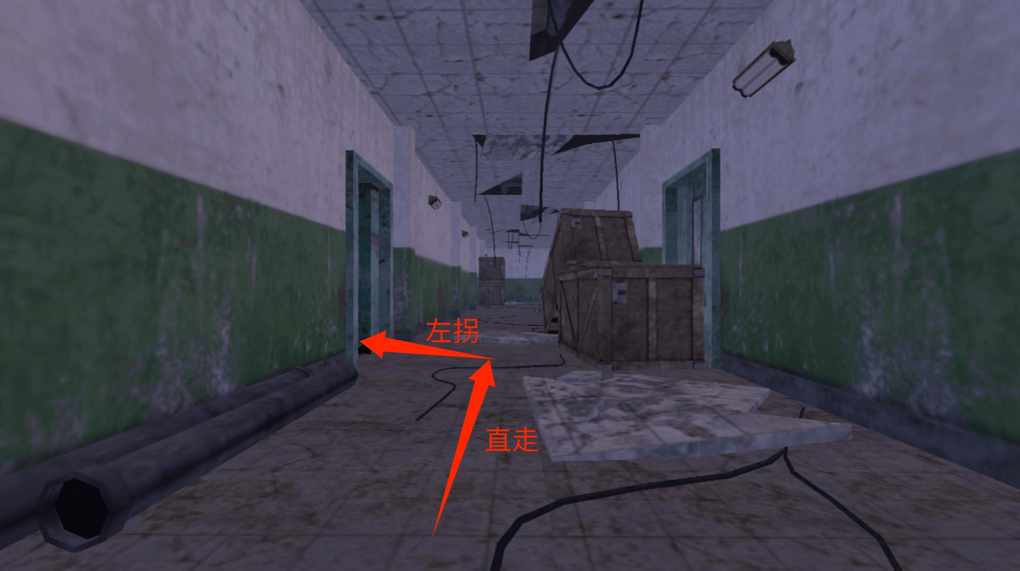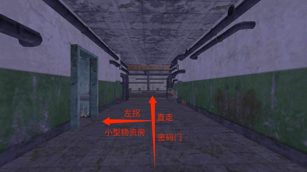 进入之后沿着通道径直前行(在行进途中,通道周围的每个角落均有物资存在)。