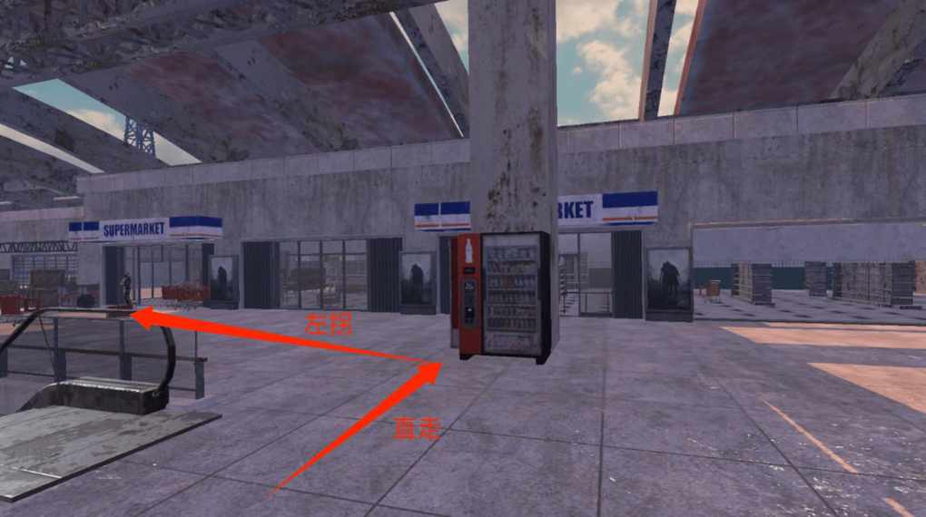 站在楼梯上方时,会发现左侧有一个饮料机模型,此时朝着左边的走廊前行。