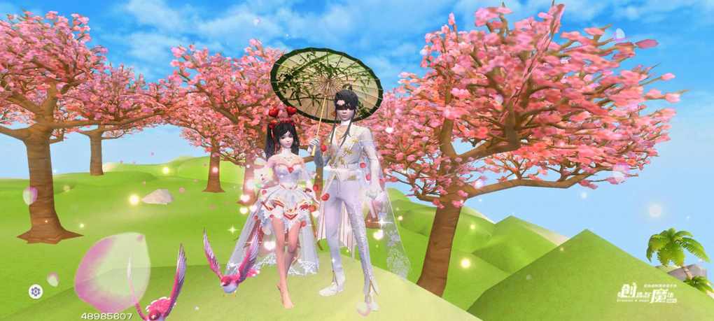 初遇时,是烂漫白昼,樱花如粉霞铺满天地。我撑着那把缀着竹叶纹路的伞,一身精致白裳,似从画中走来。你穿着带有爱心装饰的裙装,带着些许羞涩与我并肩。粉色花瓣簌簌飘落,像无数轻盈的梦,几只粉鸟绕着我们飞舞,叽叽喳喳,似在为这相遇欢唱。我们漫步在绿意盎然的山坡,看阳光透过花枝洒下斑驳光影,每一步都踩着甜蜜的节拍,空气中满是樱花的清甜与初遇的悸动。