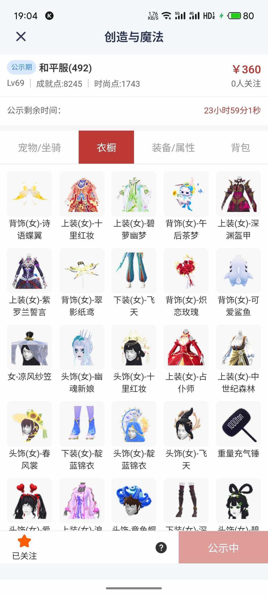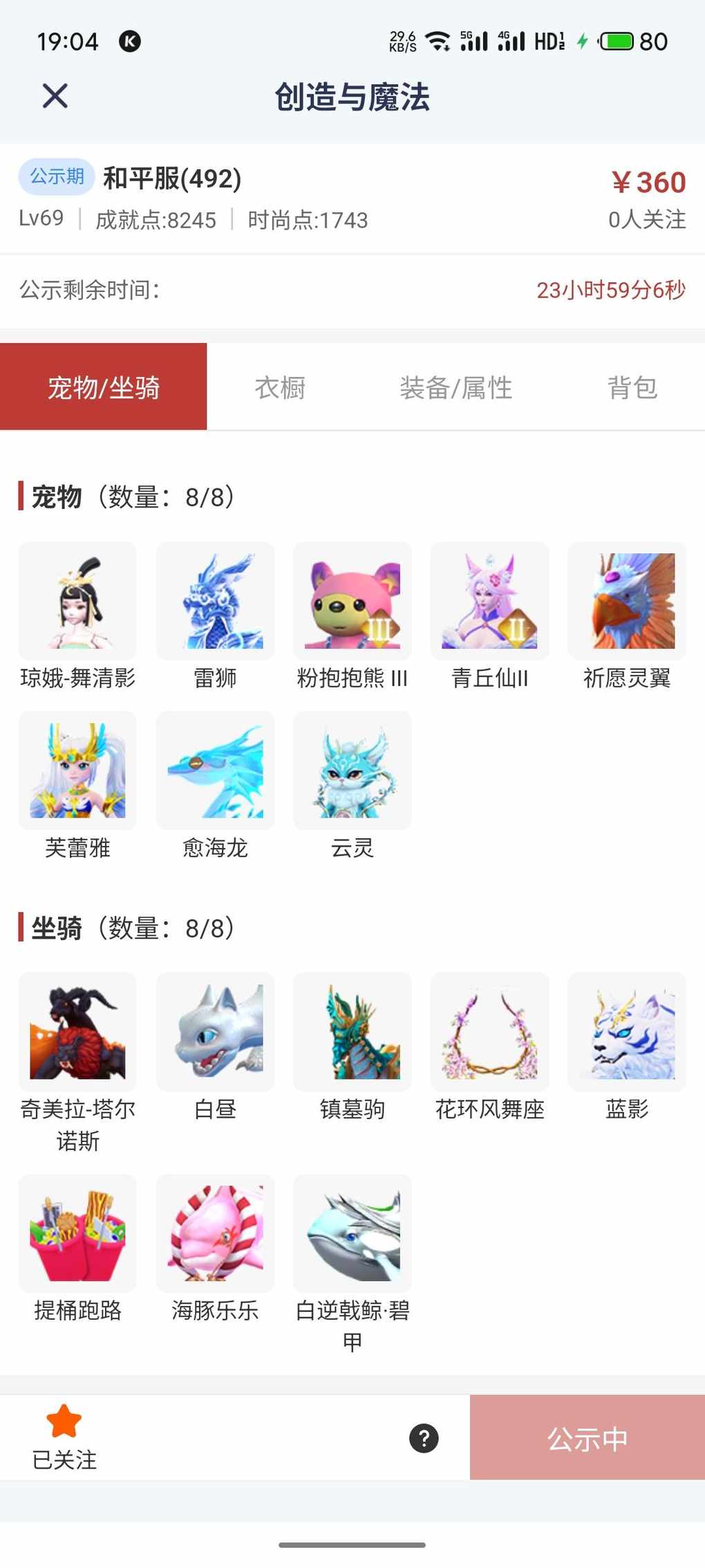 出号啦,有白昼,双人坐骑花环,镇墓驹蓝影,一套十里红和碧萝幽梦,翅膀有诗语蝶翼,午后茶梦和翠影纸鸢,传说头,甲装备,武器都在号上,属性都很棒。物有所值,大家来看看