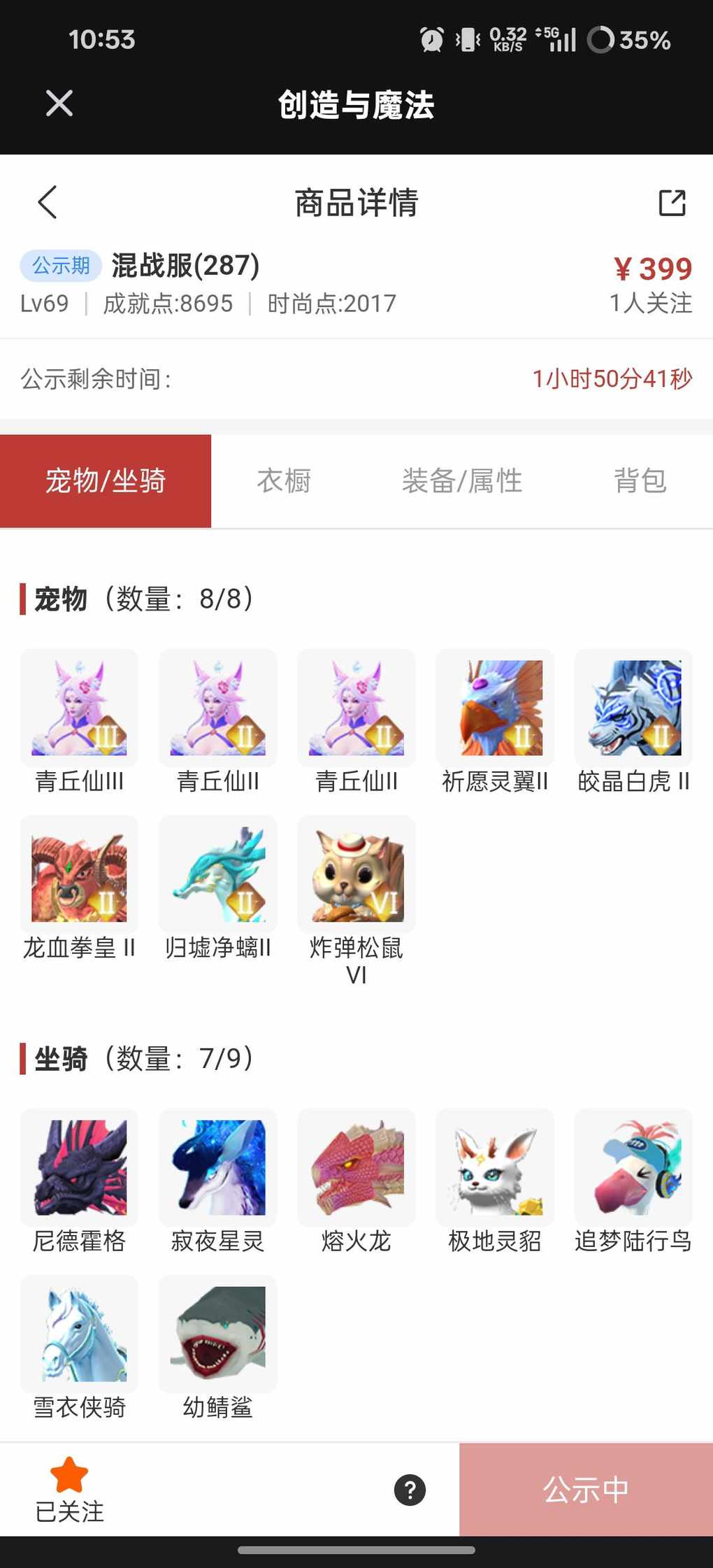 混战285-373,贝壳币差900拿小鹿,背包里还有几只宠物,退游了
