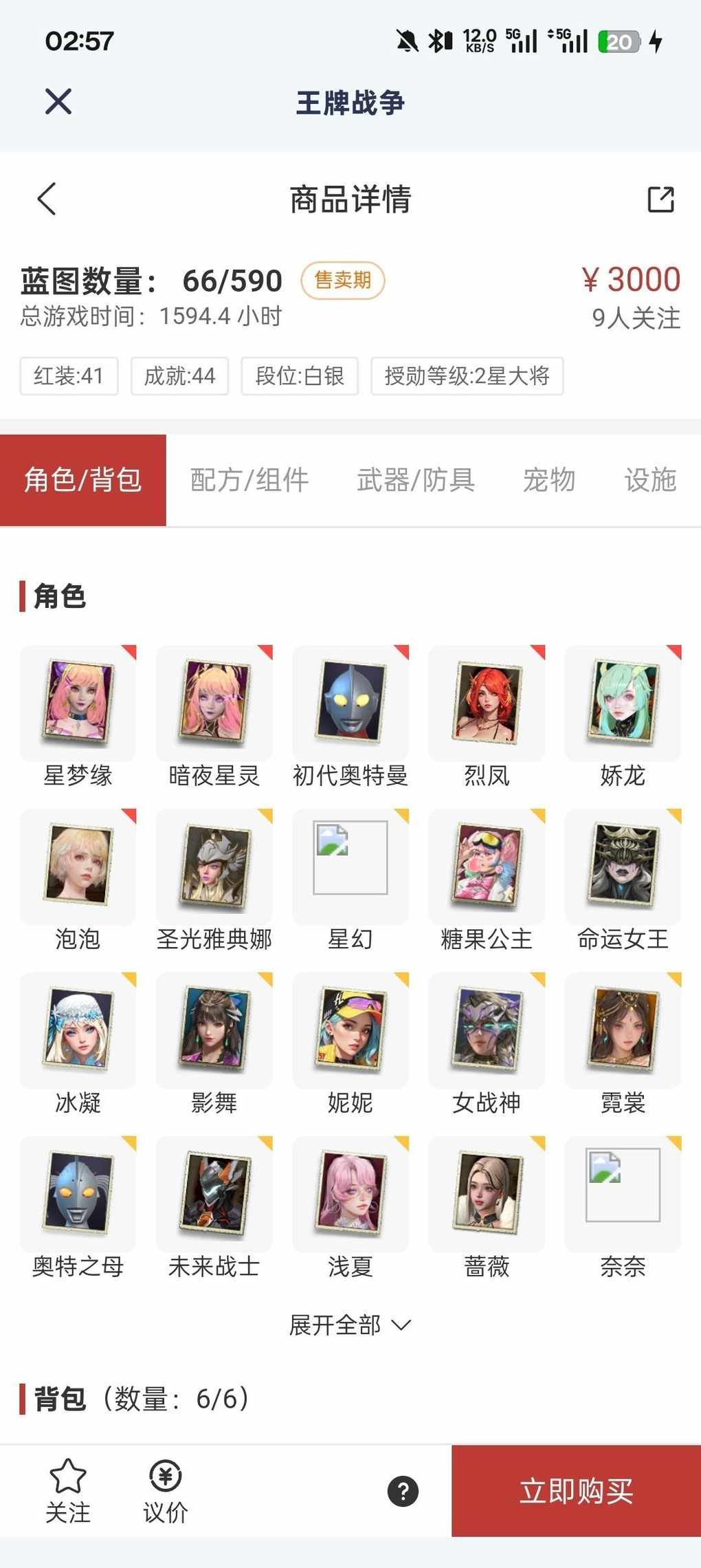 白菜价:五级星梦缘,云龙:五讯,五利齿,五突袭,五饥饿,还有个啥五级忘了,欧特;五突袭,五后盾,四利齿,五伏击,一家防,手工龙:五利齿,五突袭,五后盾,四爆破能手,貔貅:讯五,矿五,开荒小马:五讯,七级砝码,八级AK,五级双持,五级M4,机甲差个潜水舱,基地14紫瓶,三个进化强心剂,老是说没有宠物截图,我解冻又上去了,舱宝鹅上架还要再等三天,因为现在没法冻结