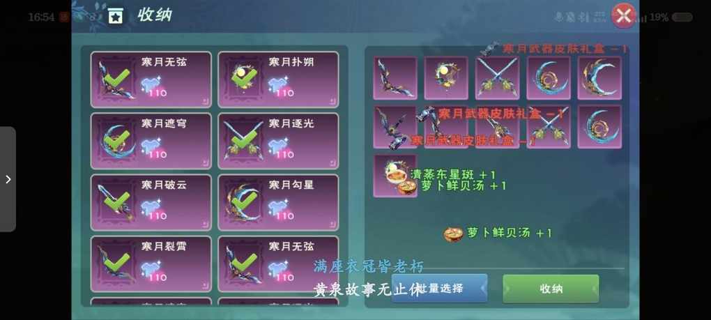 116个盒子开出5个武器皮肤,棒极了,除了狙击和爆炸弩皮肤剩下的寒月皮肤都得到了。 两个也有皮肤水晶弓和水晶驽