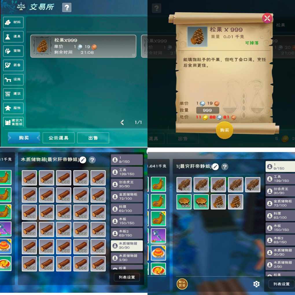 交易所松果一组11金 砍雪松树30组木材掉落一组+71个松果150组木材大概掉落五组松果+300个松果