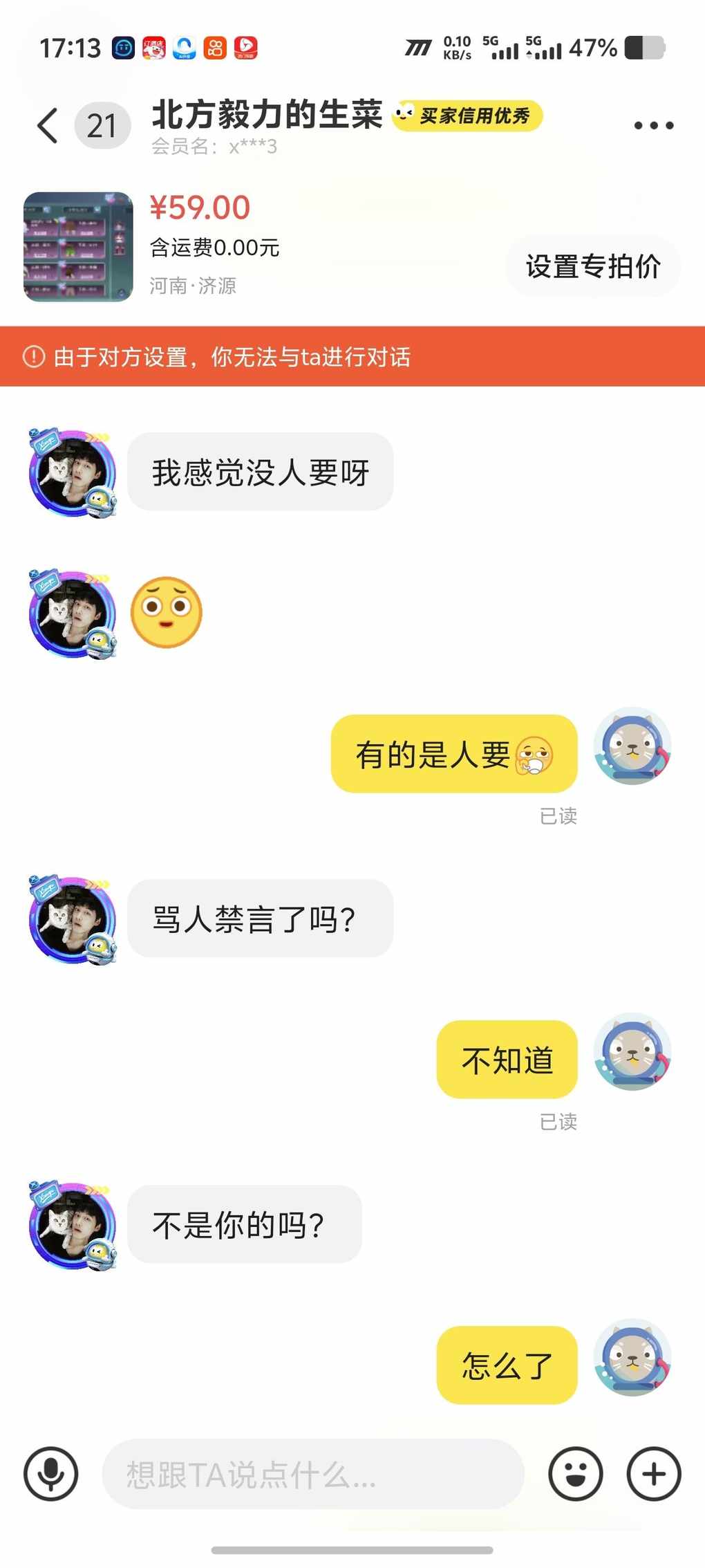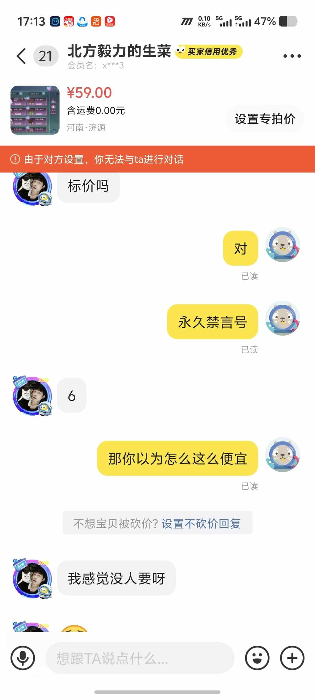 别鸟这些人,65折金币,上就问6出吗,我不出还跟我说,为什么?回答我,感觉智力好低,我回都懒得回他。