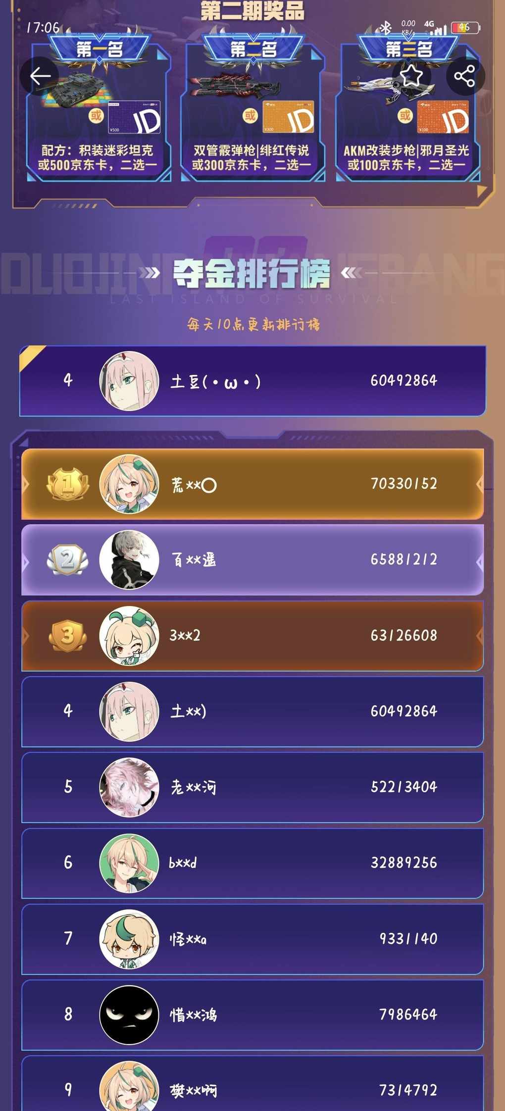 当初的个无人岛夺金排行榜2期的奖励什么时候才发?2个月了!