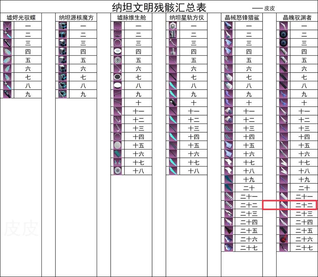 多余残骸: 墟烬光驭蝶·五、六×2、七、九 纳坦源核魔方·三、七 墟脉维生舱·一、四×2、五、六×2、七×2、八、十一×2、十三×2、十四、十八 纳坦星轨方仪·一、二×2、十一×2、十二、十三×2、十四、十五、十六、十八 晶械怒锋猎鲨·一×2、二×2、六、八、九、十一、十三、十四、十八×2、二十、二十三、二十五、二十七 晶魄驭渊者·一×2、二×2、三、七、八×2、十二×2、十三×2、十六、十七、二十、二十三、二十五×2、二十六×2