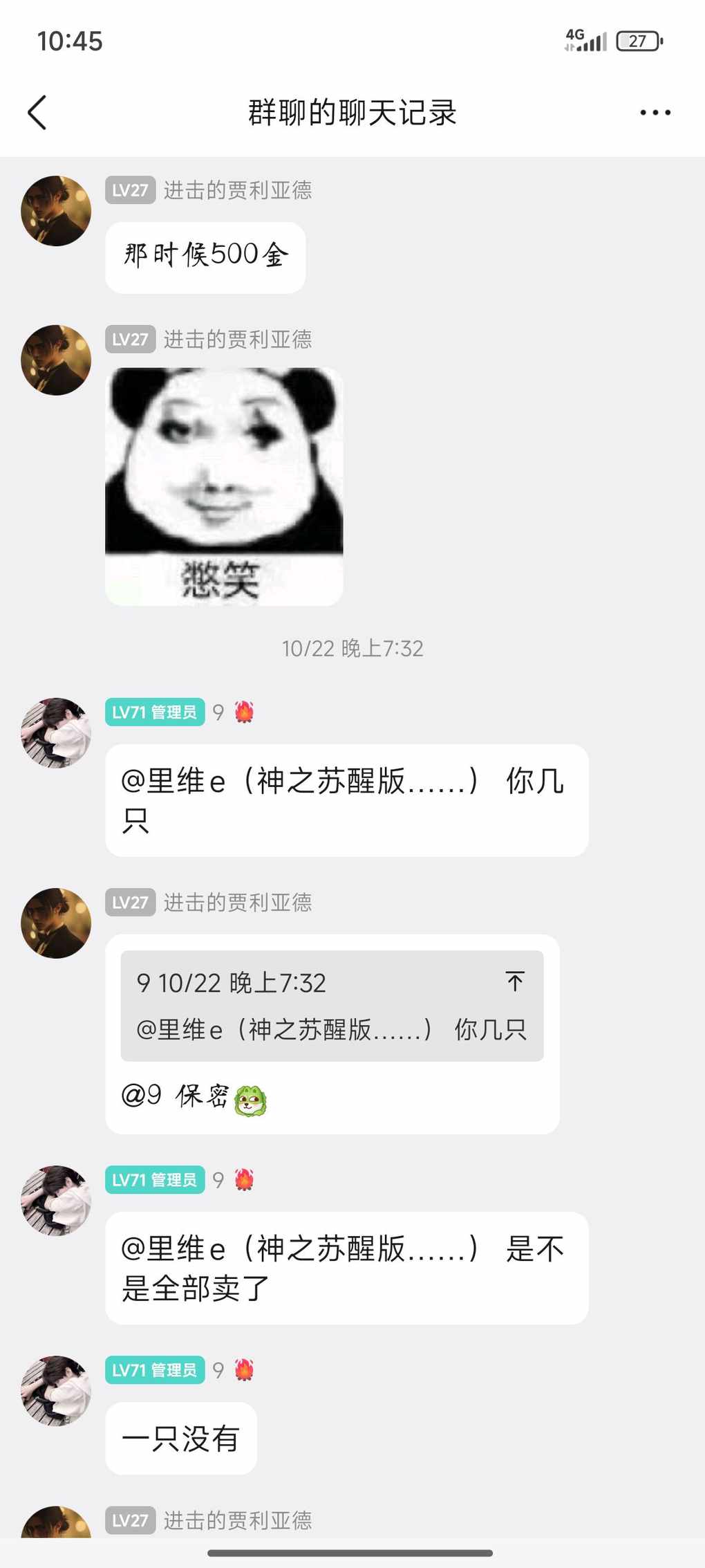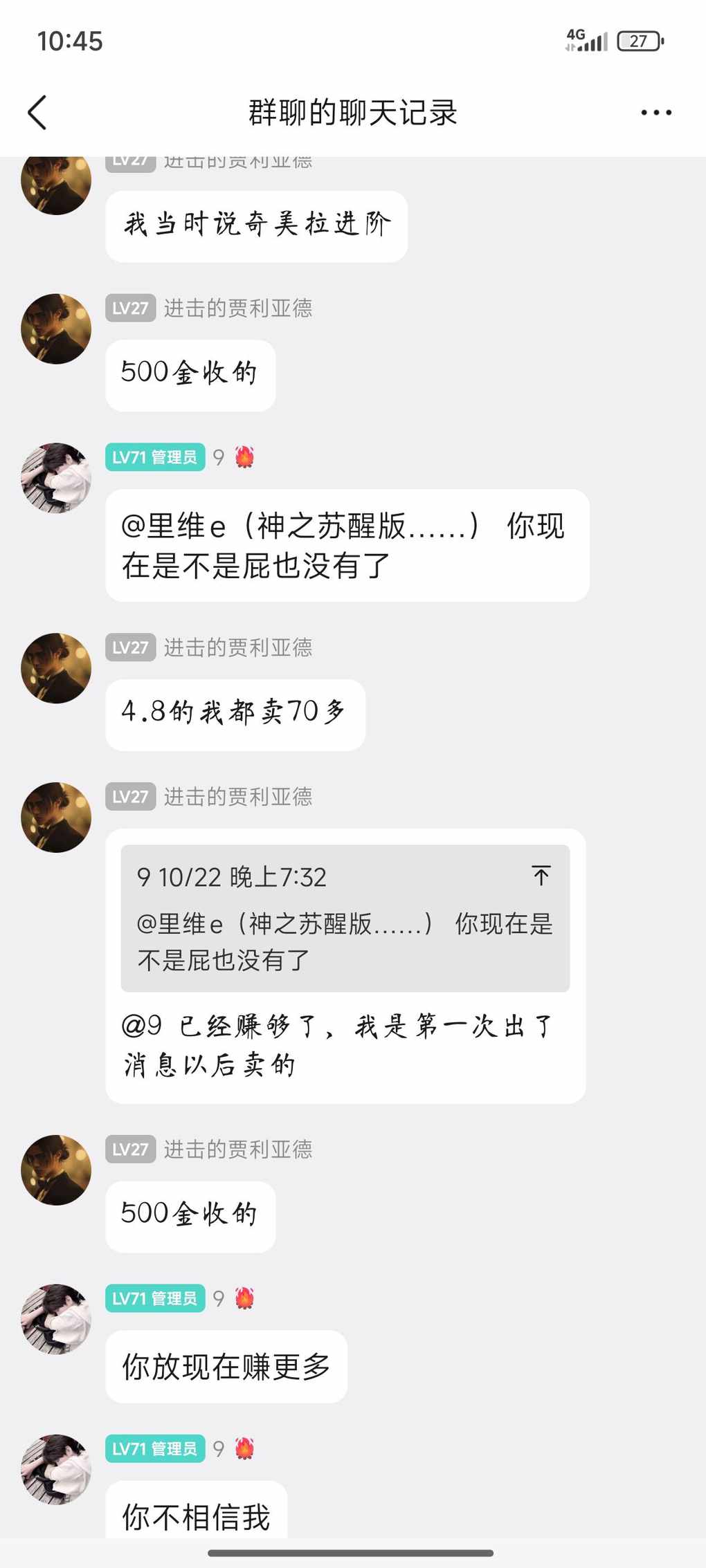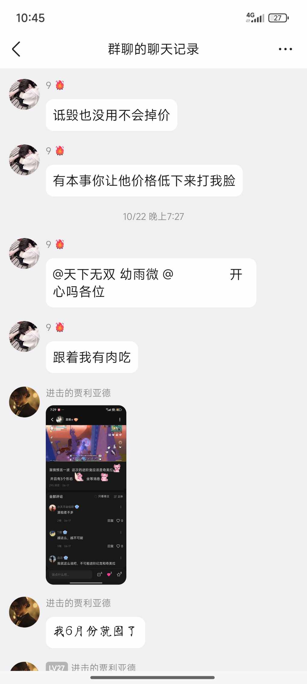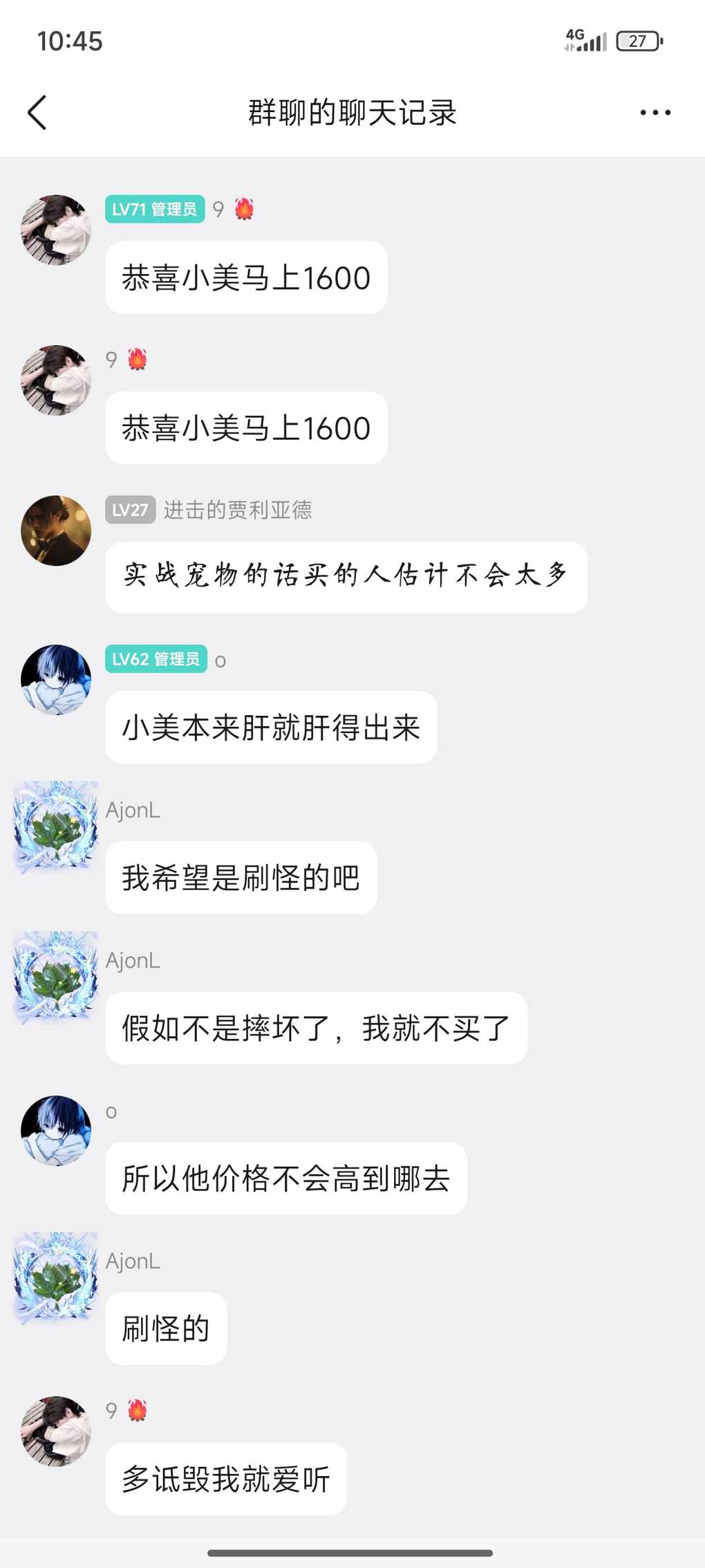 进阶前咋咋呼呼疯狂艾特全体恨不得让全世界都知道自己高价囤了40之小美,说什么不到2000--3000不死心,1000金开始控市场交易所价格他来定结果850了也没见买,现在也不说话了