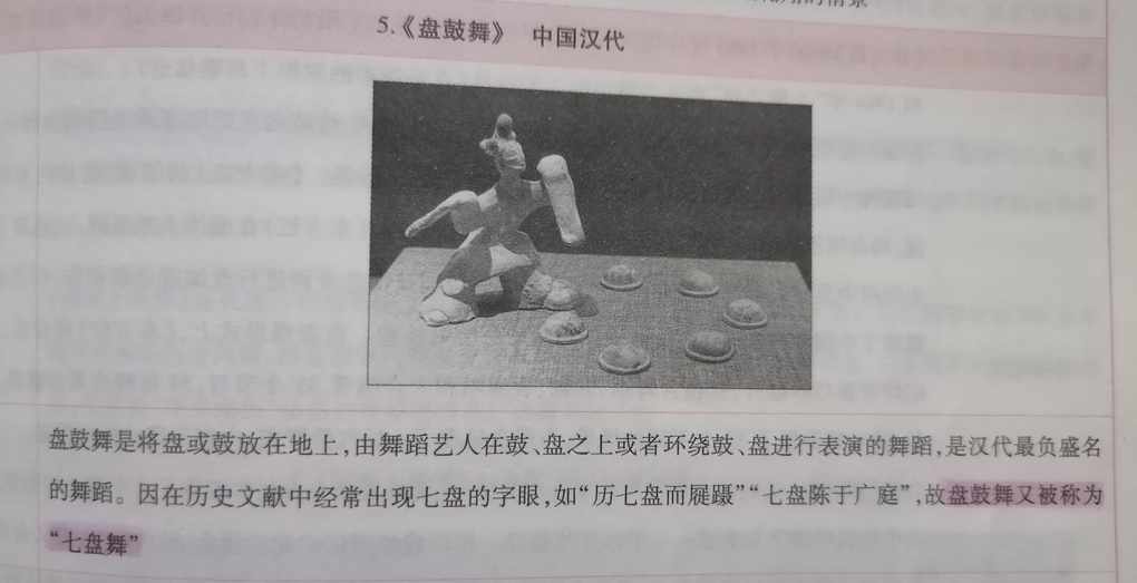 11.18 day16盘鼓舞是将盘或鼓放在地上,由舞蹈艺人在鼓、盘之上或者环绕鼓、盘进行表演的舞蹈,是汉代最负盛名的舞蹈。因在历史文献中经常出现七盘的字眼,如"历七盘而展蹑""七盘陈于广庭",故盘鼓舞又被称为"七盘舞"