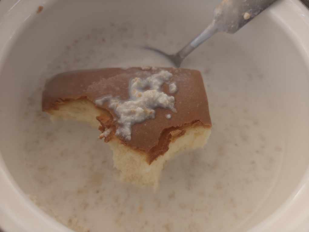 嗯嗯嗯,牛奶燕麦,又弄了一块小蛋糕,甜的,好吃