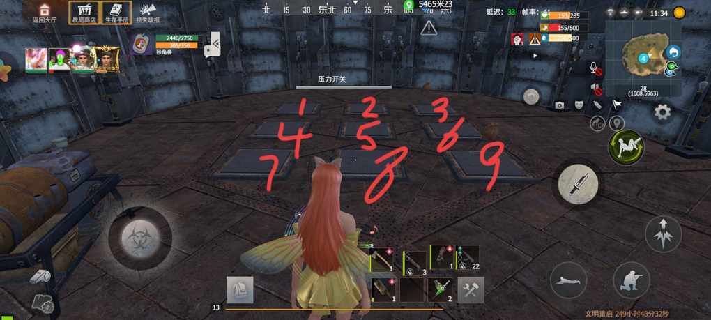 逍遥在这里给伙伴们标记了开关的顺序。旁边发电机放上少量油,就可以去踩4号开关,门开后,里边有怪物和发电机,同样,发电机放少量油,出来后踩9号开关,进去放油,剩下最后一个开关,那就是1号。1号开关踩开后就能看到第二个物资箱了。如果踩错了,那就不好意思了,只能请你们接收追踪的洗礼了。注意这里的开关顺序是4 9 1,踩错就去看追踪。