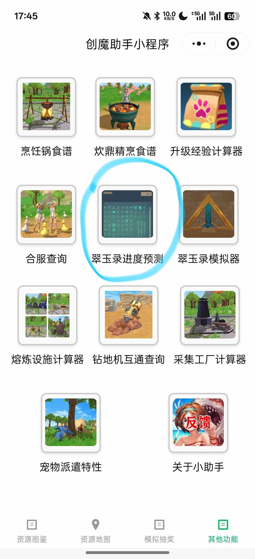 不知道翠玉路还要多久的看过来 今天手把手教你还要点几下 第一步:点开微信 第二步:点开微信右上角的搜索(如图一) 第三步:搜索创魔助手(如图二) 第四步:点进小程序 点其他功能(如图三) 第五步:点翠玉路进度模拟(如图四) 第六步:按照大概点击次数输入(如图五) 第七步:往下滑就可以看见你每天炼多少棱锥所需要的天数了(如图六)