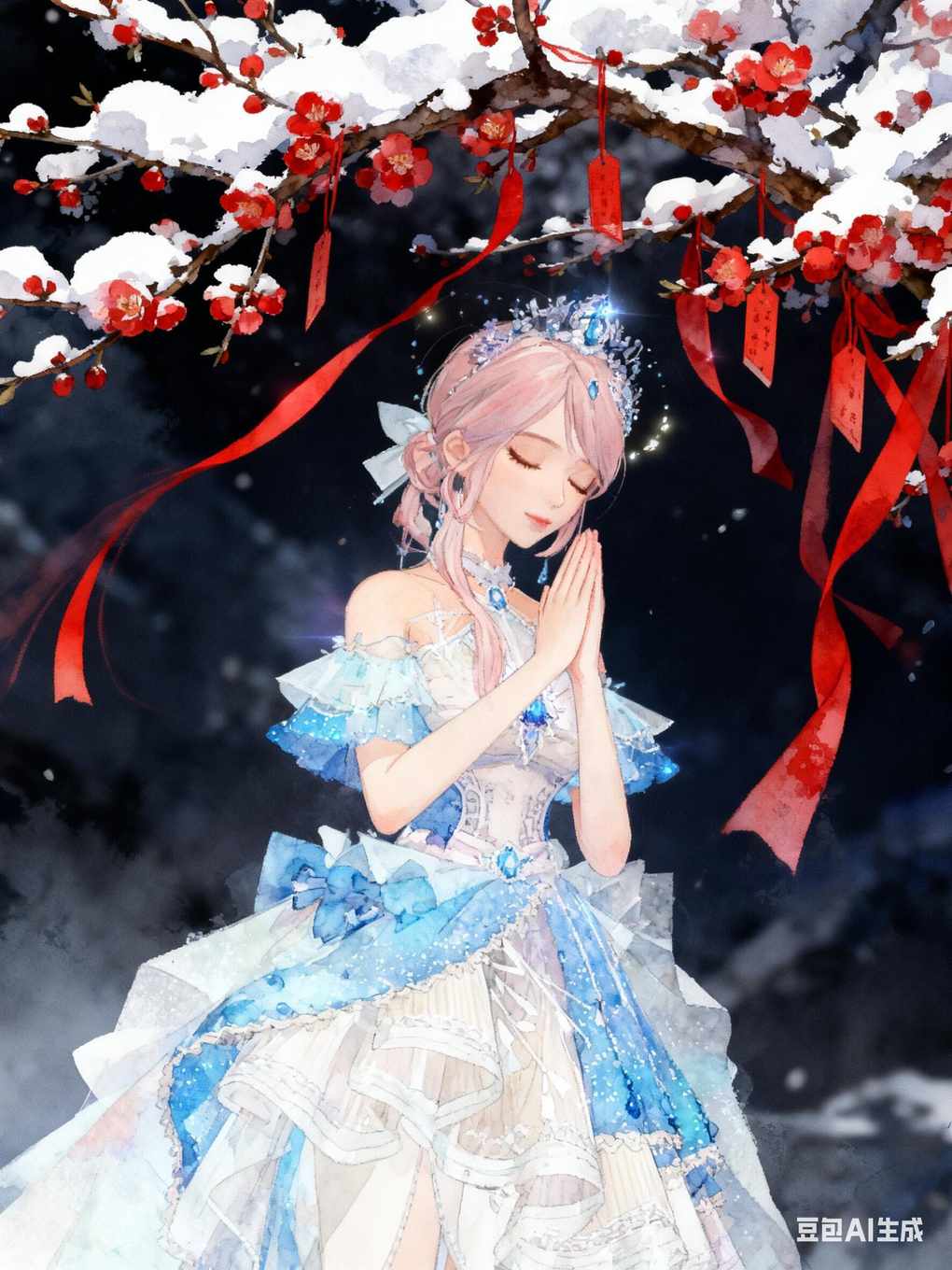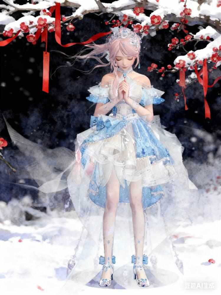 参考图中人物发型和服饰生成,完整保留图中角色的长相发型和服饰包括发饰。白雪,红梅,头发飘飘,飘带,古风,氛围感,站立,低头闭目,双手握在胸前做许愿姿势