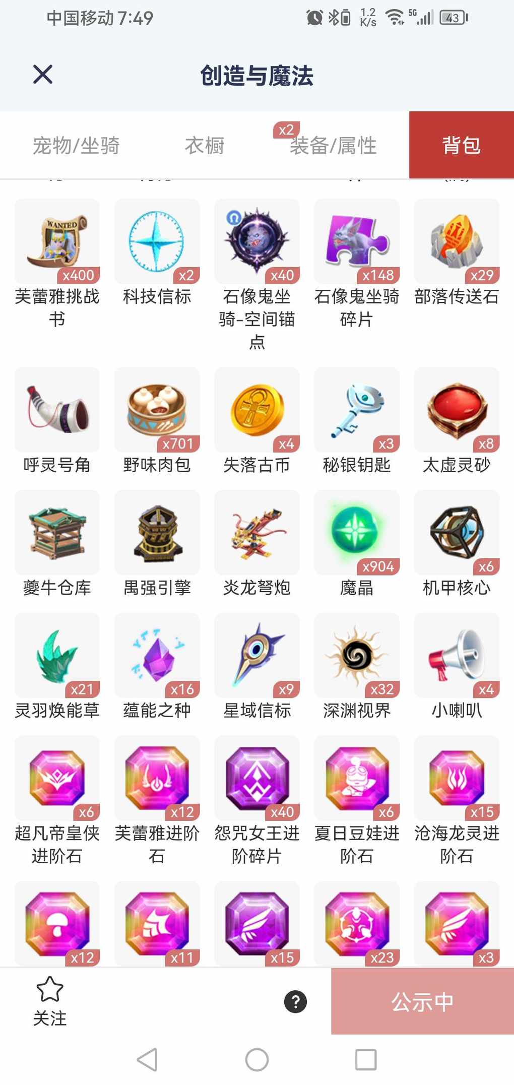 看一下,还有500金币,章鱼还差3到4个进化果牵手,海龙进阶石我买了15个了,花园已开,水滴够升4介了,满丹药满魔法,石像鬼碎皮也打了100多了
