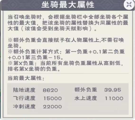 这里大致可以认为:我坐骑栏里有云龙时,骑小鸟也能达到云龙的飞行速度,其他属性同理。此外,负重机制也有改动,即使不骑坐骑时,也能有坐骑带来的高负重加成。基于这个机制,推荐大家配置:云斑鹦鸟1只、大顽皮蝾螈1只、暗黑霸王龙1只,来保证水陆空都有坐骑可以用。