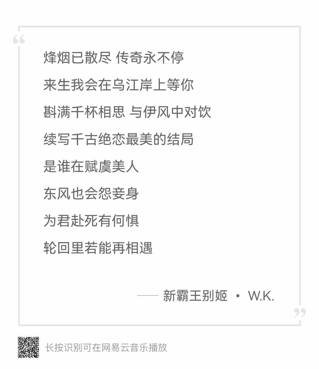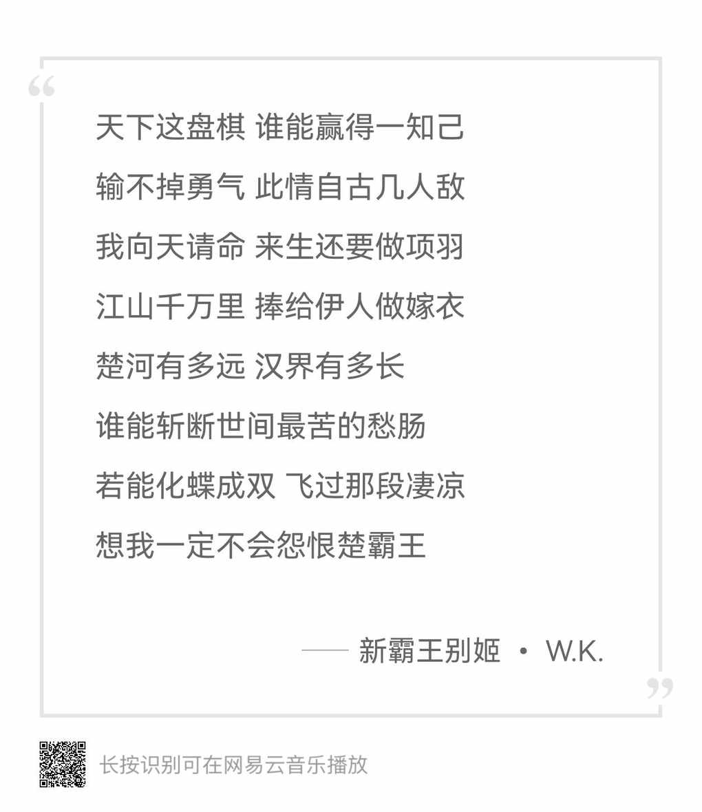 #分享一首伴有戏腔的古风歌曲【新霸王别姬】·WalkerDay16.节选歌词:“是谁在赋虞美人,东风也会怨妾身,为君赴死有何惧,轮回里若能再相遇。”这歌的中间部分,保留了戏曲唱腔特色感觉听得心都快碎掉了曲中尽是悲壮与不甘心疼霸王的无奈落幕或许在权利面前太过于重情重义之人,终究还是难成大业也是天命难为吧12.16/周二/多云/19°