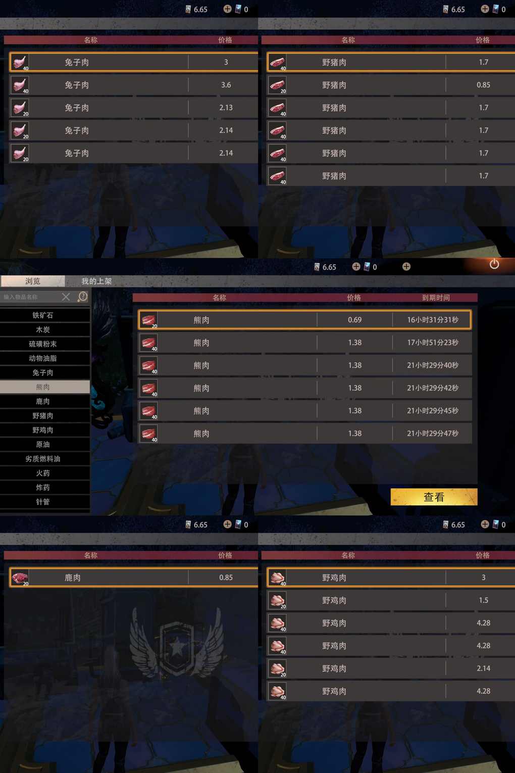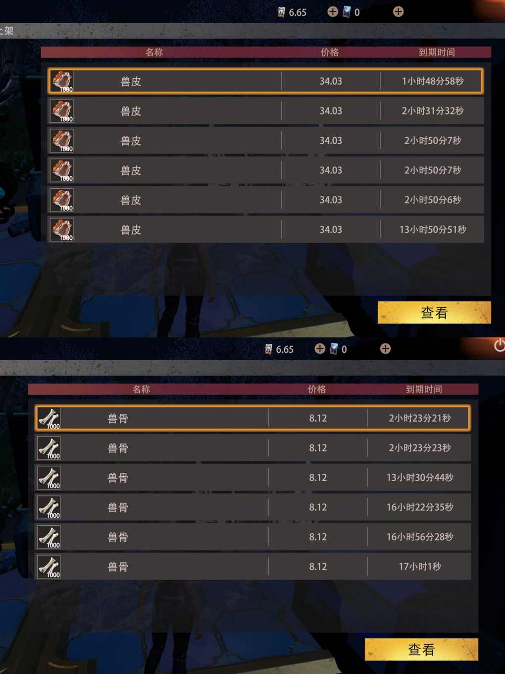 兽皮(单价34.03)兽骨(单价8.12),不同道具的售卖到期时间不同,可按需选择。