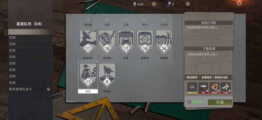 基地背包升级需要消耗兽皮、兽骨,升级后可提升基地背包上限