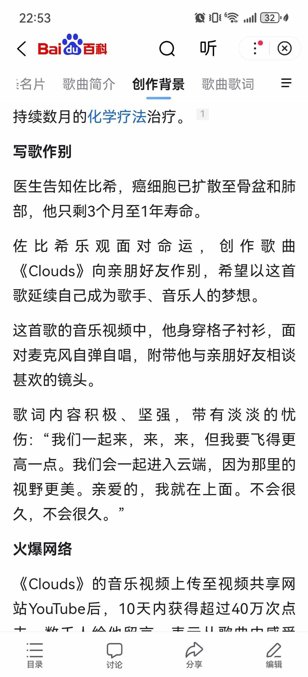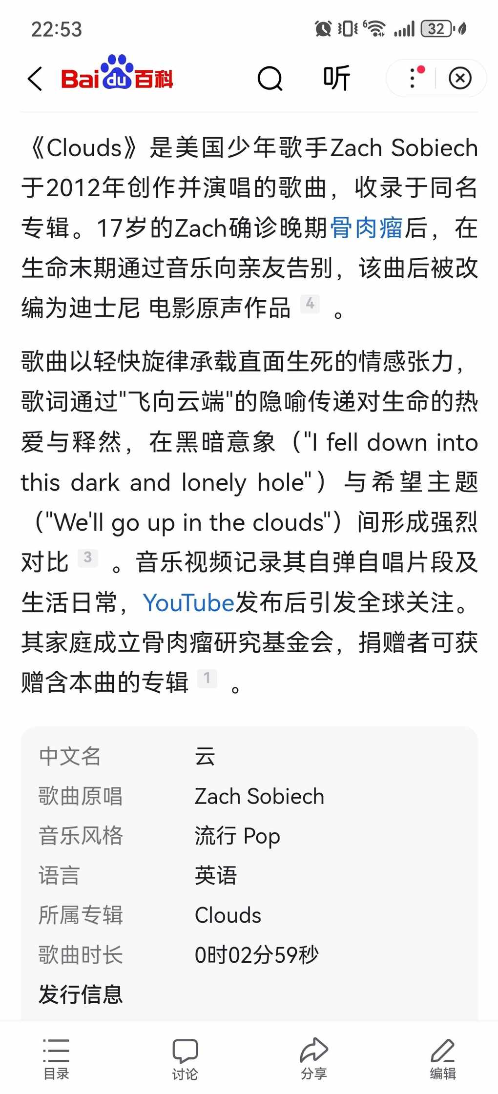 『《Clouds》是美国少年歌手Zach Sobiech于2012年创作并演唱的歌曲,收录于同名专辑。17岁的Zach确诊晚期骨肉瘤后,在生命末期通过音乐向亲友告别,该曲后被改编为迪士尼 电影原声作品。』