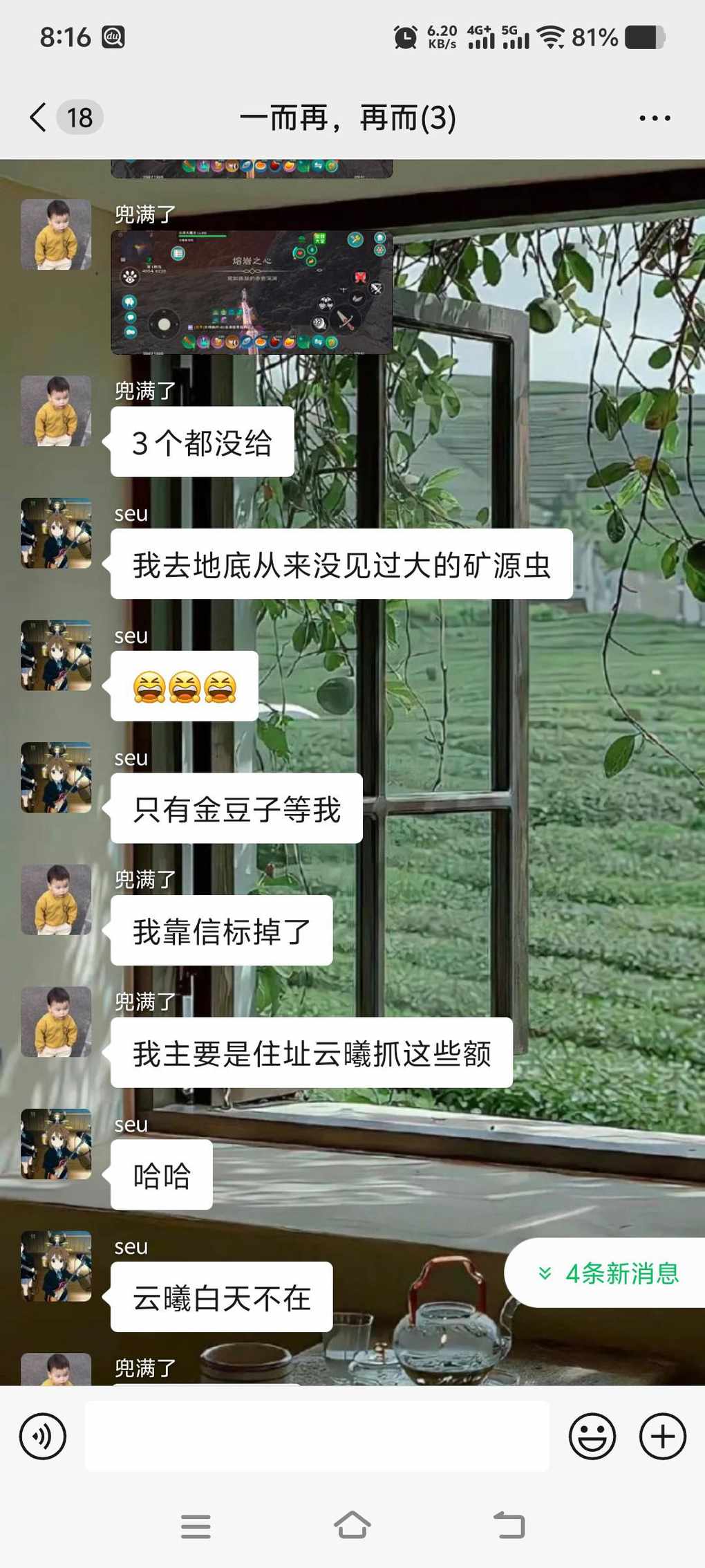 12月6号,打完神殿我就说要开石像鬼,因为俺不打迷城,只能靠石像鬼拿迷城币,云语说不让开,八嘎,然后俺就没说话,他觉得俺生气了就说‘哎呦喂,你个老傻子还生气了,我直接就是给你100金币’然后我说还不如换成10个木头哈哈哈哈哈哈哈(猛猛吃家银们)