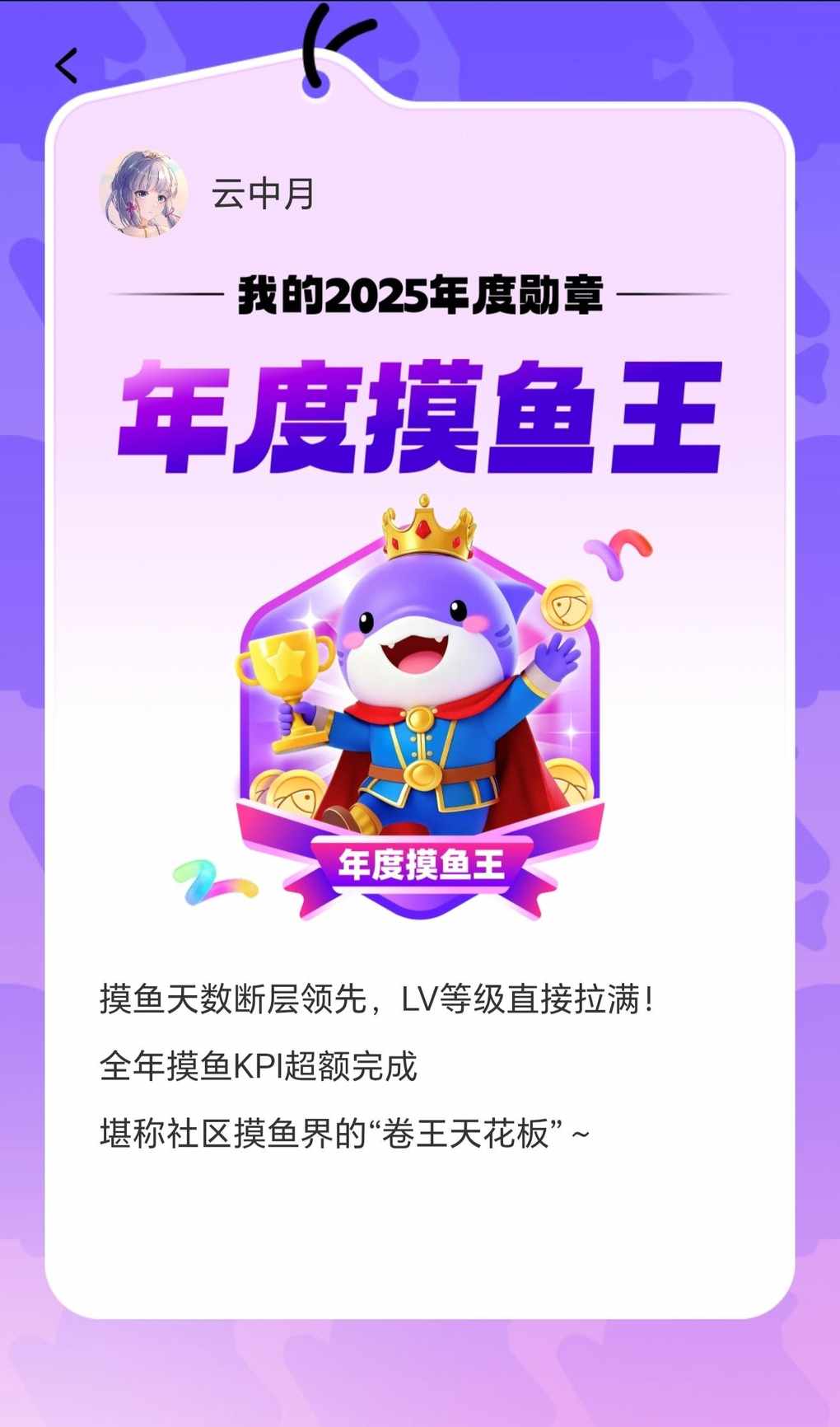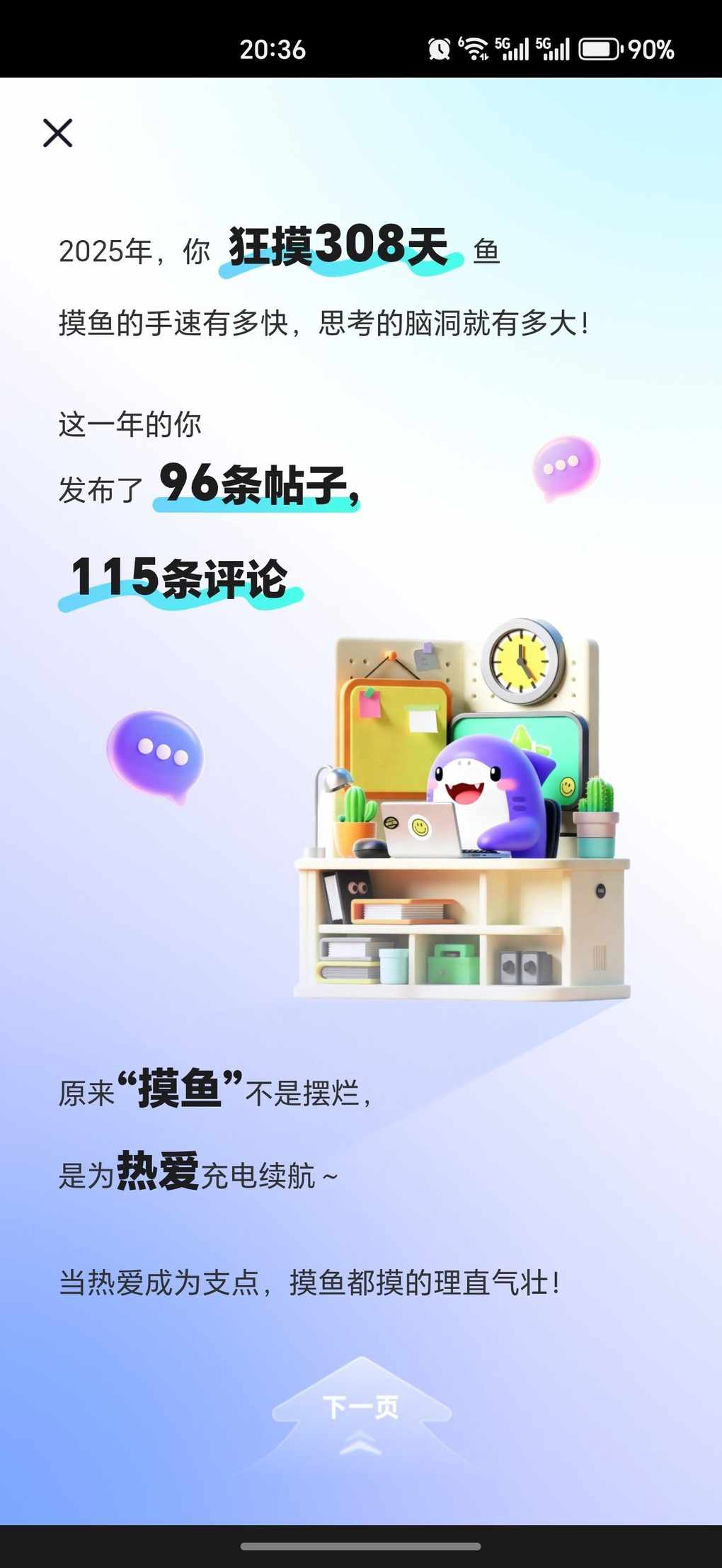 对于我这个经常潜水的人来说,已经尽了最大努力完成摸鱼社活动,还遇到了一直为我点赞的朋友,谢谢你给了我坚持发帖的动力。希望在新的一年,每个人都能有新的收获,生活顺利,身体健康,马上有钱!