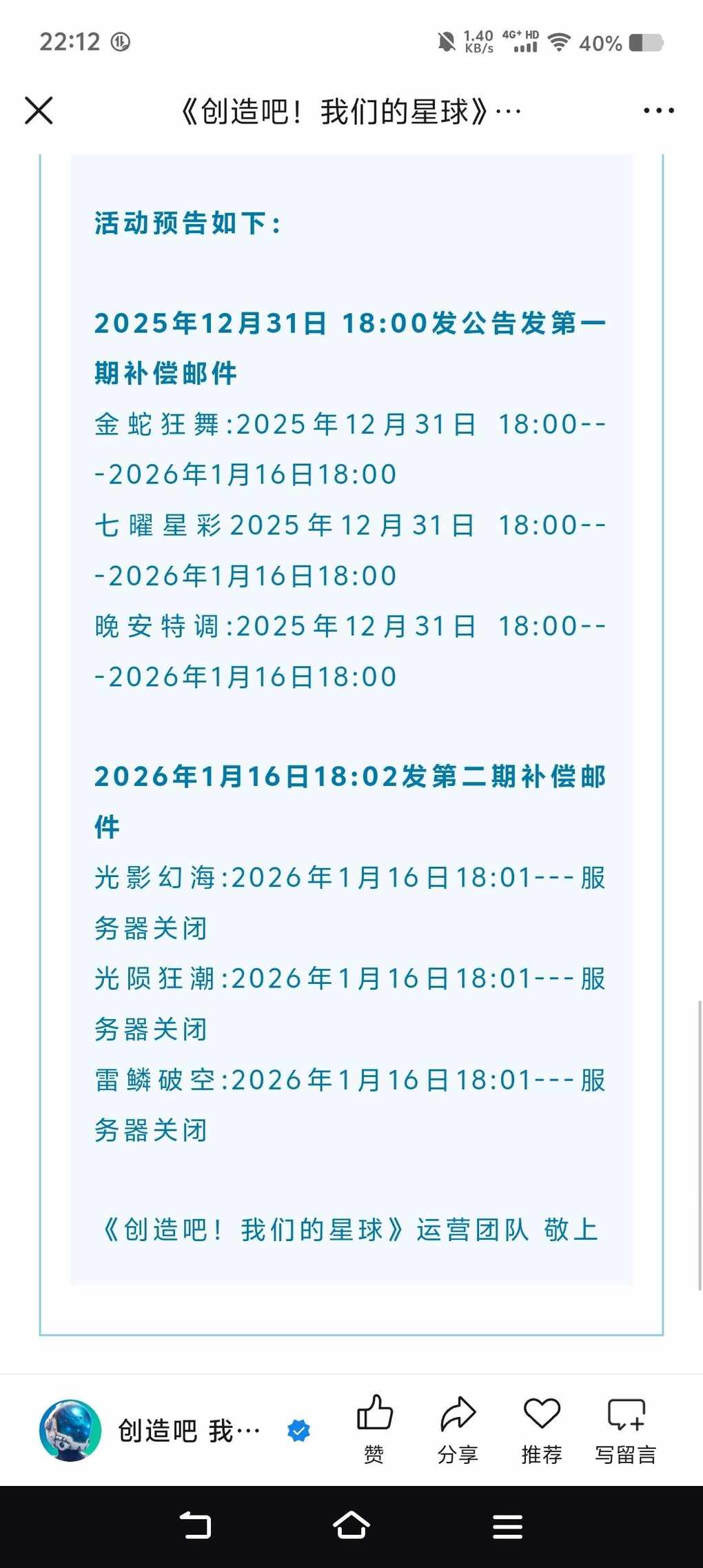 好久没来创球版区发帖了,直到真正看到了停服通知看到通知的那一刻,回想自己在四个星球上度过的每一天,回想自己做过的每一个任务,回想自己给创球花过的324元,想起了手机可用空间变红时长按点击的卸载,想起了steam愿望单上那个依然是“即将推出”的创造吧我们的星球……“本次探险的坐标已抵达终点,但广袤的星图永远为勇者展开”最后一次,给创球说一声再见2025年12月32日