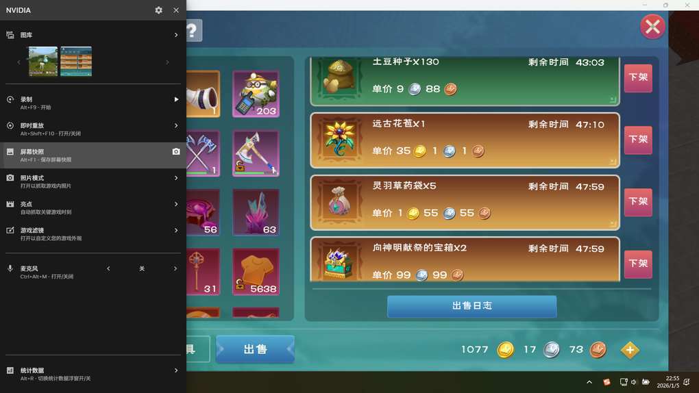 【第4天】今日金币1077金,今天下实训下的早,多肝了一会。N卡截图不知道发啥电没有隐藏那个窗口,也懒得重新截了。今天把之前赛季开的祭坛权限材料出了一波赚了蛮多。交易所挂的东西还没卖完,卖完今天应该能到1100金的。下周就要期末考了,我的复习任务非常艰巨啊服了。