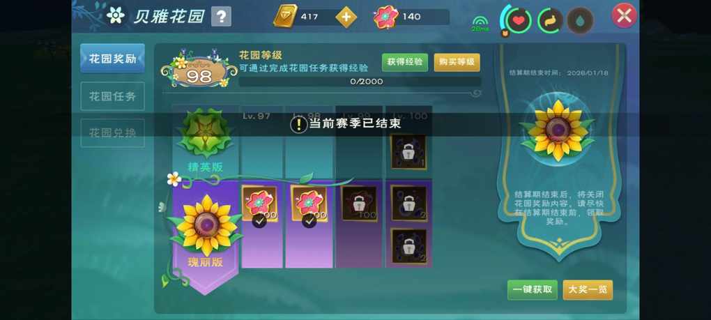 什么叫花园结束了?????老子才97级啊我还要花160点卷补两级