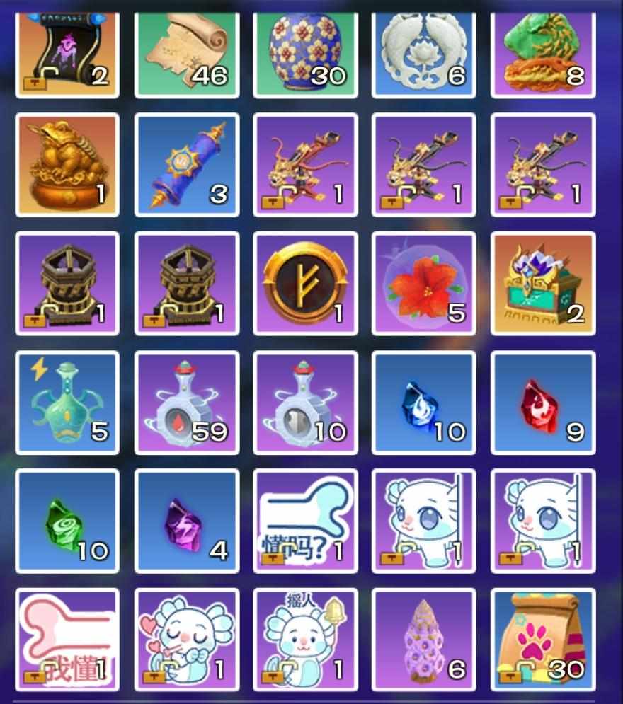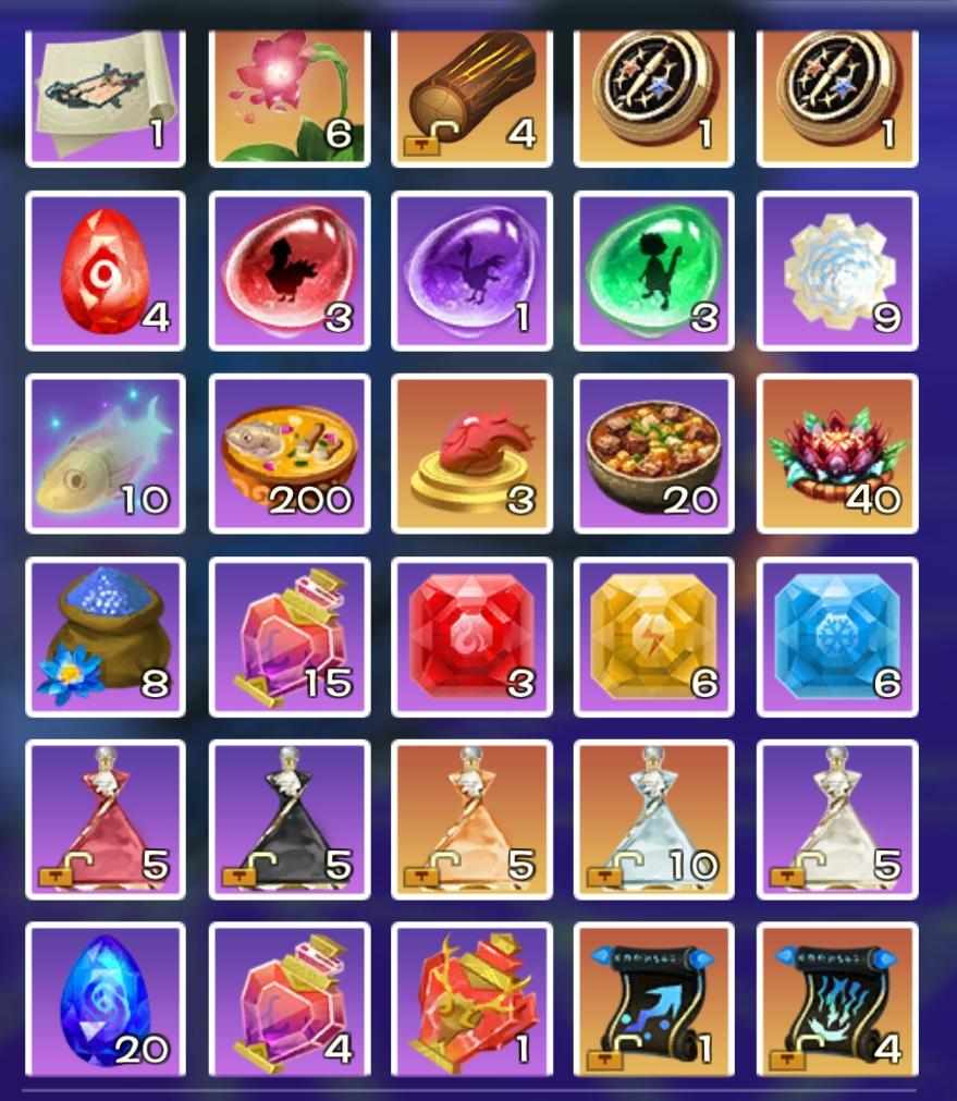100张高级藏宝图曾经~寒月木2、蓬莱须1、星盘1黄牛~苁蓉花3、苁蓉花苞3、希乌泡泡5杂货~黑镜5、精灵鱼10、高粱30、蓝莲种子4再来和最后~藏宝图和高级藏宝图1-10符文~四级附魔石3特别介绍「稀有的金色宝箱~天工图1」这玩意经常在紫色和橙色箱子里藏着