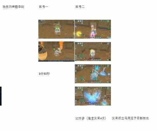 场景4神殿这个我也没想到,因为最开始我觉得,既然都是神殿了,那海龙总归比帝皇侠快吧,但因为样品不够,因为刷一把都要十分钟我前面测那个冰魔晶就已经花了差不多两个小时了,没耐心了啊,反正测出来的结果是帝皇侠比这个海龙快了将近2分钟,当然不排除是神殿格式的原因,并且这个海龙特别傻,打一次神殿发呆了四次,要是他发呆之后不收回去那他的时间应该还要延长,应该得到15分钟左右才能刷一把