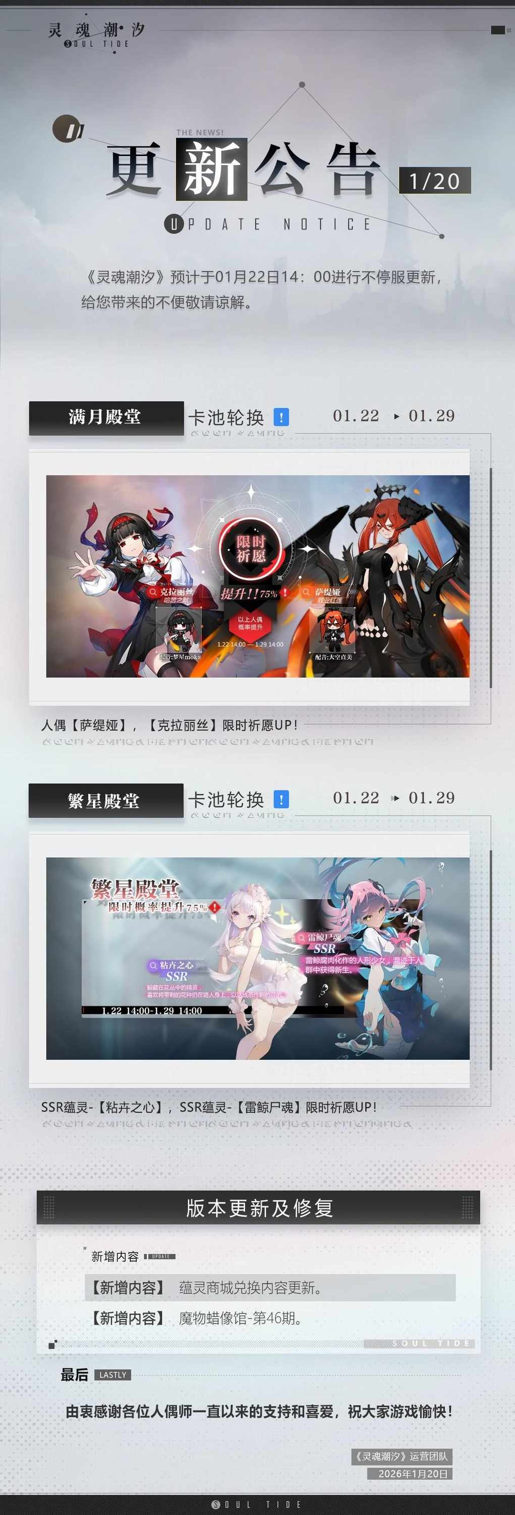《灵魂潮汐》1月22日不停机维护公告《灵魂潮汐》预计于1月22日14:00进行不停机更新,给您带来的不便敬请谅解。