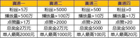 2.由粉丝量、播放量、点赞量综合统计参与赛道,例如:播放量点赞量满足赛道一条件,但粉丝量不足5万,则按照赛道二进行奖励发放。