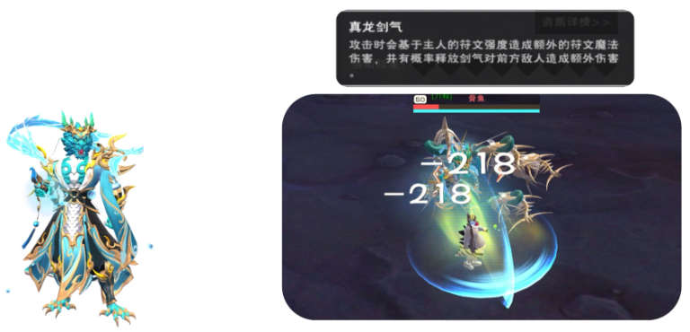 技能1:群伤,根据主人的符文强度额外造成伤害,并且有概率释放一道剑气,剑气路线都能打到