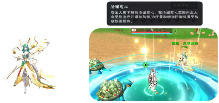 技能2:释放一个领域在范围内增加防御并治疗,效果受自身的防御影响