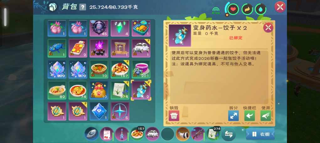 那还是不要了吧,存一个饺子放在口袋里,想变身的时候就快速拿出来变身,然后再迅速放回去。他给的那个消耗的饺子只有一天的体验时间,但却能无限变身,你变身后跳进去煮完道具才会消失