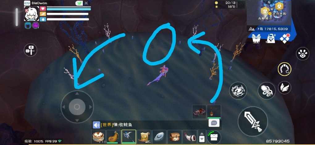 这是椭圆平台,蓝箭头区域是两团树矿区,中间圆圈处刚好可以回体力,如果发现第二区树矿还没挖完体力就掉空了的话可以在圆圈那里一口气多回一些