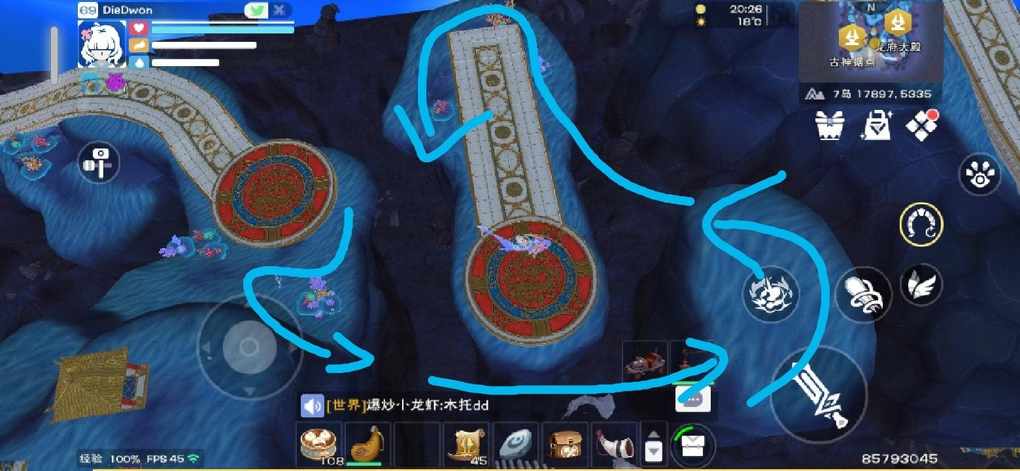 在地图上看和实景都放出来啦,起点在古神据点飞出来的椭圆平台,然后按照黄线(蓝线)刷就好,下面给同学们详细介绍一下