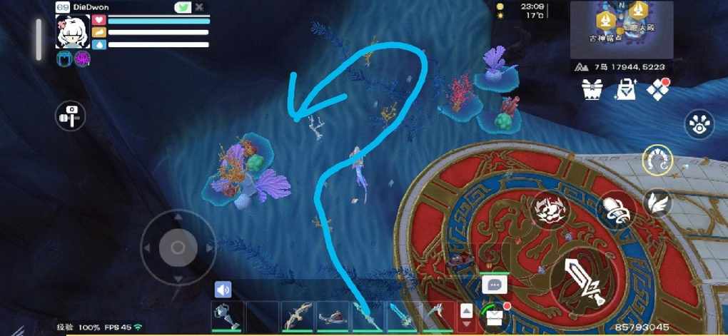 这里是第三个点了,这个地方树矿比较乱,推荐按照箭头路线一上一下,刷完后方便飞回去,还有注意的是有一棵卡在地图珊瑚造景里面的金枝,不是很好砍到,硬砍会浪费时间哦,建议直接跳过