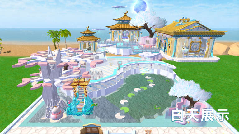 建筑名称:流云仙境规格:世界服满级家园38*38类型:创意月宫古风原创制作:三酒复杂度:54264设计理念:既要体现出月宫材料的奢华,又要显得空灵梦幻,一层以太极图为基础进行设计,半水半空间。上面空间则进行多平台错落开,挑高悬空设计。白色粉色搭配大量玻璃材料,和月宫材料有明显的色彩对比,夜晚也是更加明亮。END图文作者/三酒制作/发发