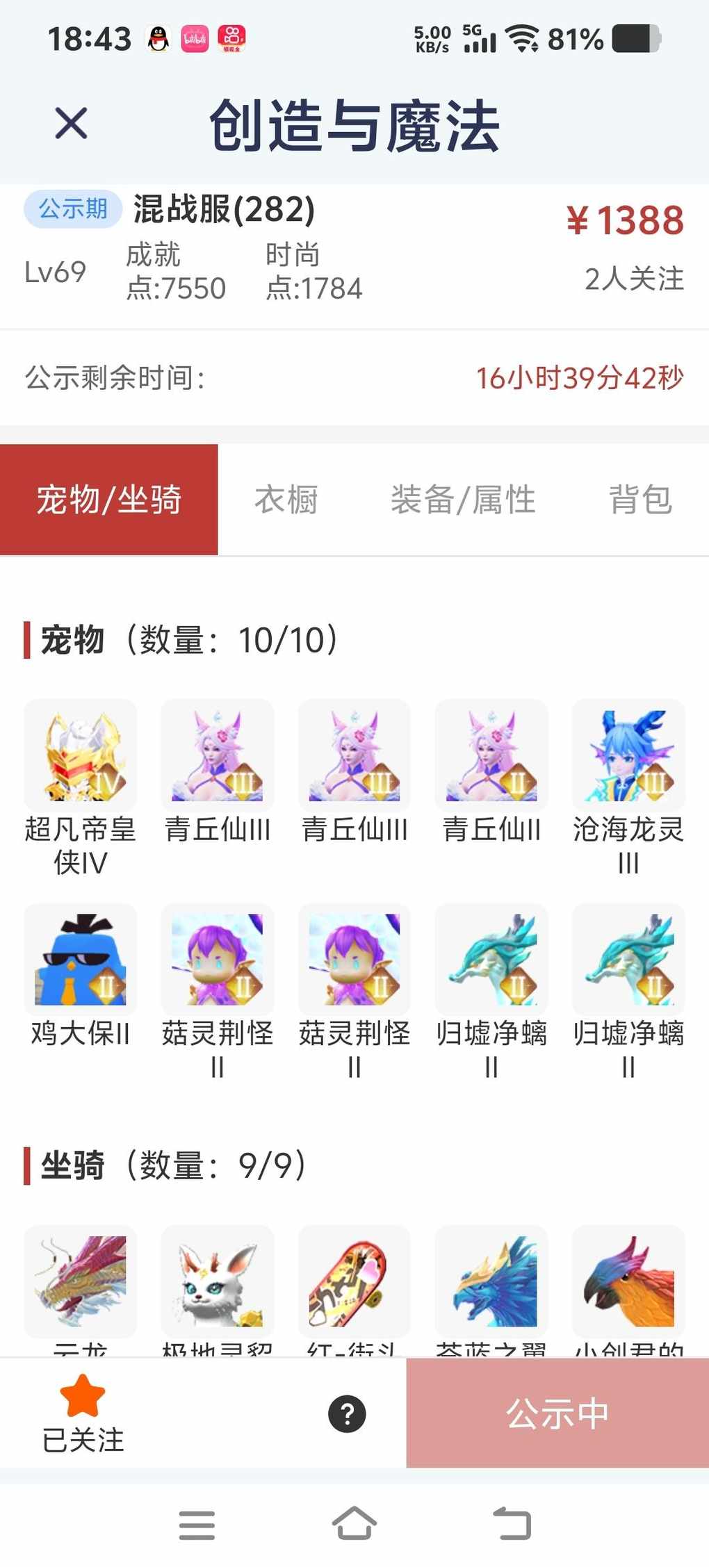 (求关注)108合服热门出性价比云龙小实战坐骑:云龙宠物:3海3狐3狐2狐2归2归2菇2菇4阶帝皇侠马上5阶(全部宠物带等级,个别是小极品)服饰:黑天鹅、羲卦云衣、武器皮肤两套加寒月御剑和爆炸弩!!!有补天动作!!!小钱装大逼!潜鳞裤子带新出的最强金词条背包邮件有物资 33个蛇神坐骑碎片