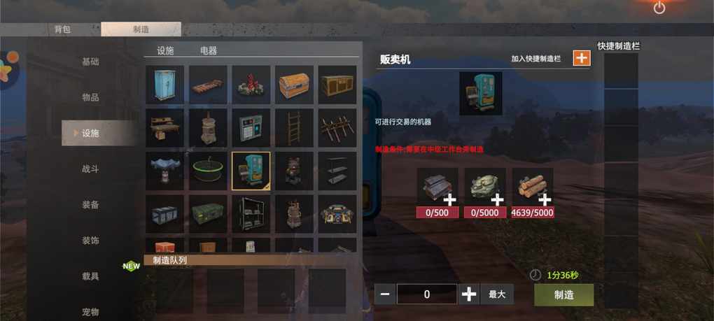 贩卖机制造需要等级五级,需要在中级工作台旁边只要。材料只需5000木头,5000石头和500铁锭,这样的制造条件非常低了,人人都做的起。