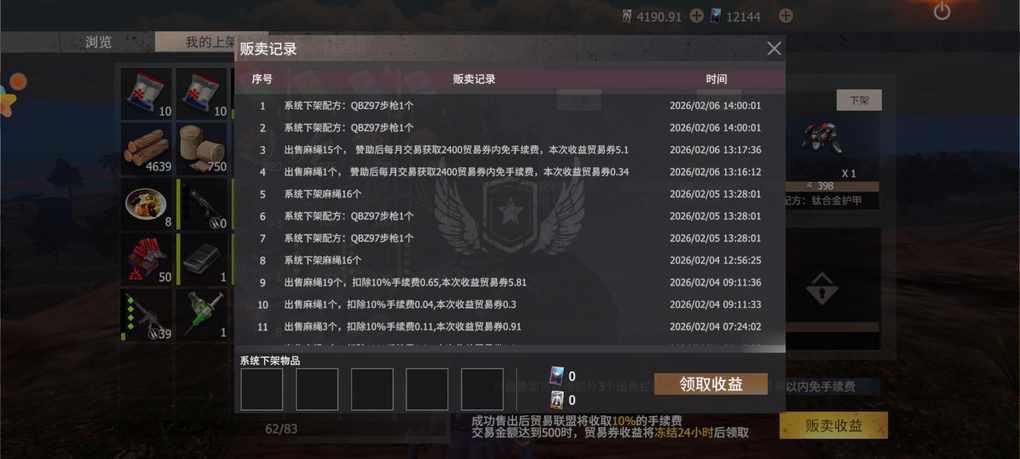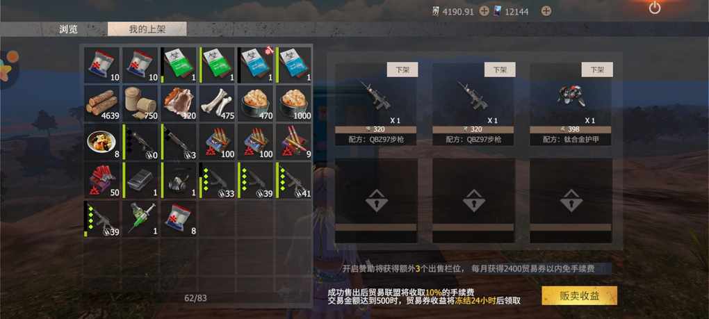 每个贩卖机初始可以上架三个物品,开通赞助可以上架六个物品,而且还免除2400贸易券的手续费。没有赞助需要收取10%手续费。把不需要的物资上架,可以换取贸易。在出售的物品价格大于500,并且卖出,有冻结时间,需要24小时才能取出收益。
