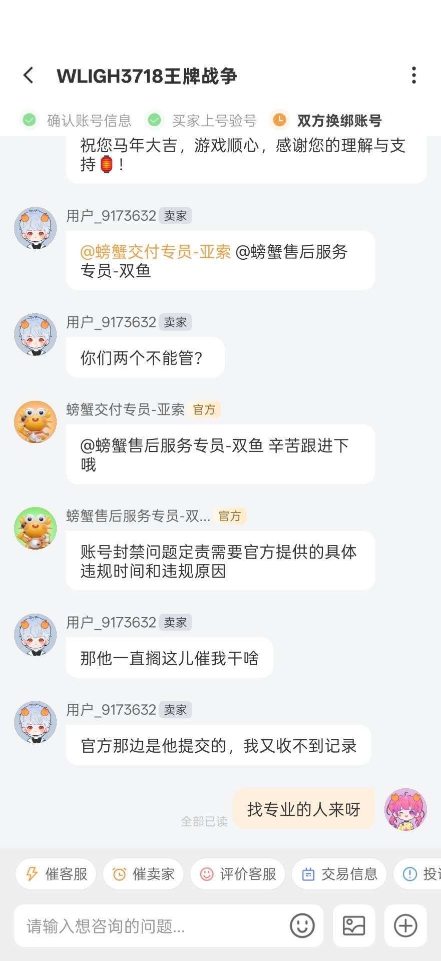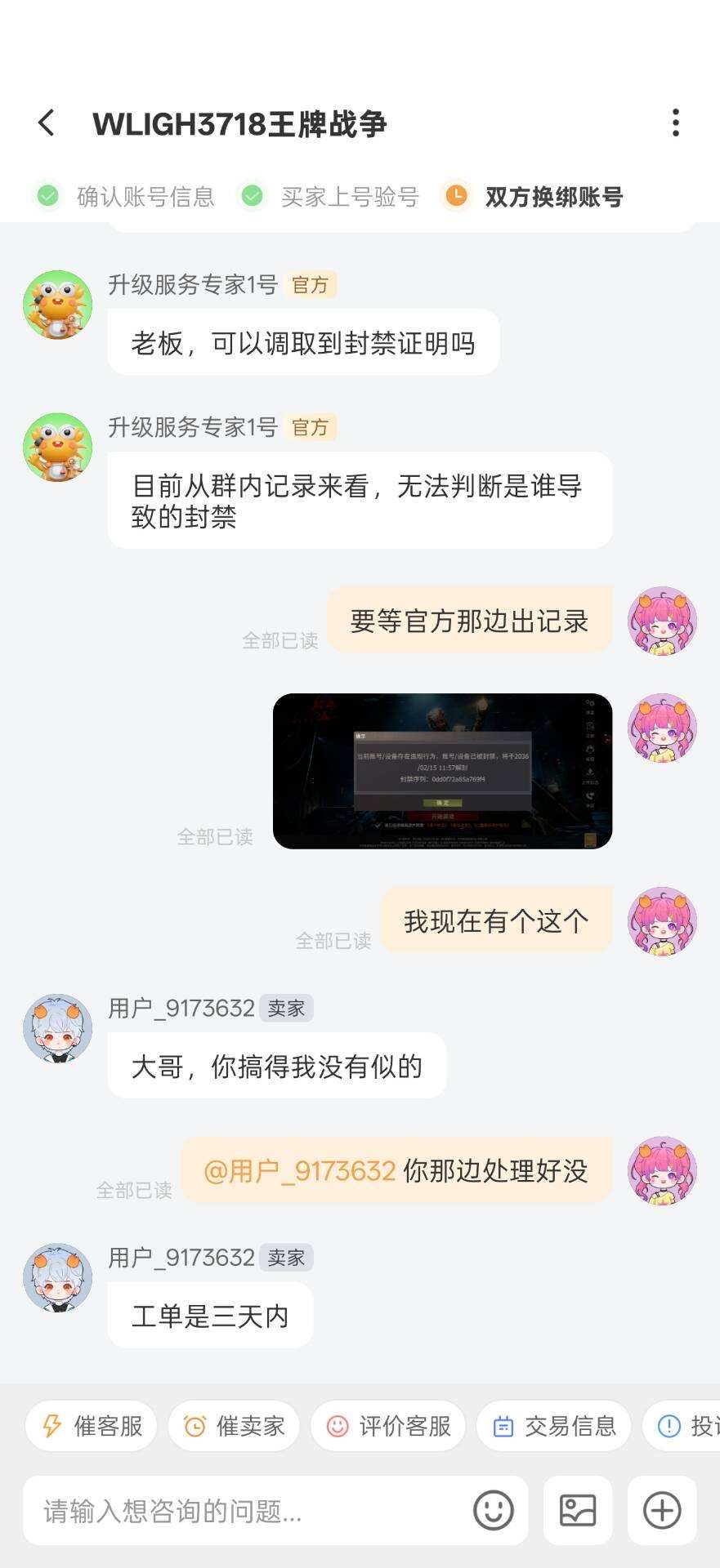 你好官方,我这边有问题想询问,2月16号晚上,我在螃蟹交易平台购买了账号,ID为23619999073,但这个号在2月17号晚上8点多钟我登号时被封禁了,封禁时间为,2036年2月15日11:57分,这买入账号期间,我没有做出违规行为,现在我与卖家产生了交易纠纷,还望请官方大大,帮忙查询,被举报的具体时间/与封号时间/与此账号的封禁详情原因,麻烦你们了,我很热爱这款游戏[玫瑰]