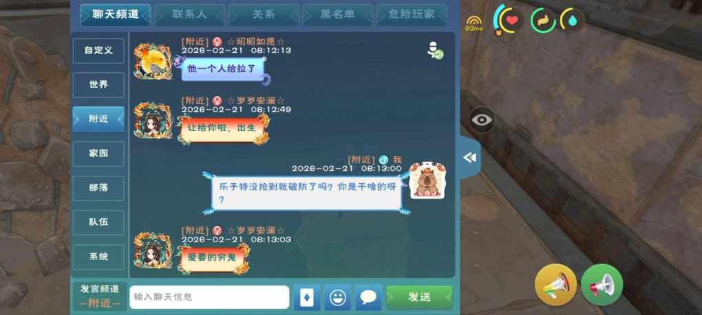 上次就是我们三个在对峙,然后他突然间卡掉线了,我们俩拿了之后嘲讽他一句,连我部落和我名字一块上世界,还跑我部落群里撒欢,关键我是部落首领